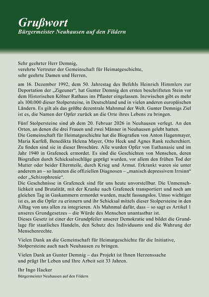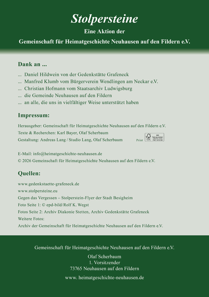 die Stolpersteine in Neuhausen persönlich zu setzen. Bedanken möchten wir uns bei Herrn Bürgermeister Ingo Hacker und dem Gemeinderat, die uns bei unserer Aktion in hervorragender Weise unterstützt