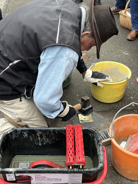 Die Mitarbeiter des Bauhofes hatten sehr gute Vorarbeit geleistet und exakt große Löcher in den Bürgersteig gegraben, in die dann die Steine eingebracht werden konnten. Gunter Demnig brachte Zement und Sand in die Löcher ein und setzte dann den Stolperstein sorgfältig ein. Die Ritzen wurden ebenfalls mit Sand und Zement aufgefüllt, so dass die Stolpersteine wirklich fest saßen.